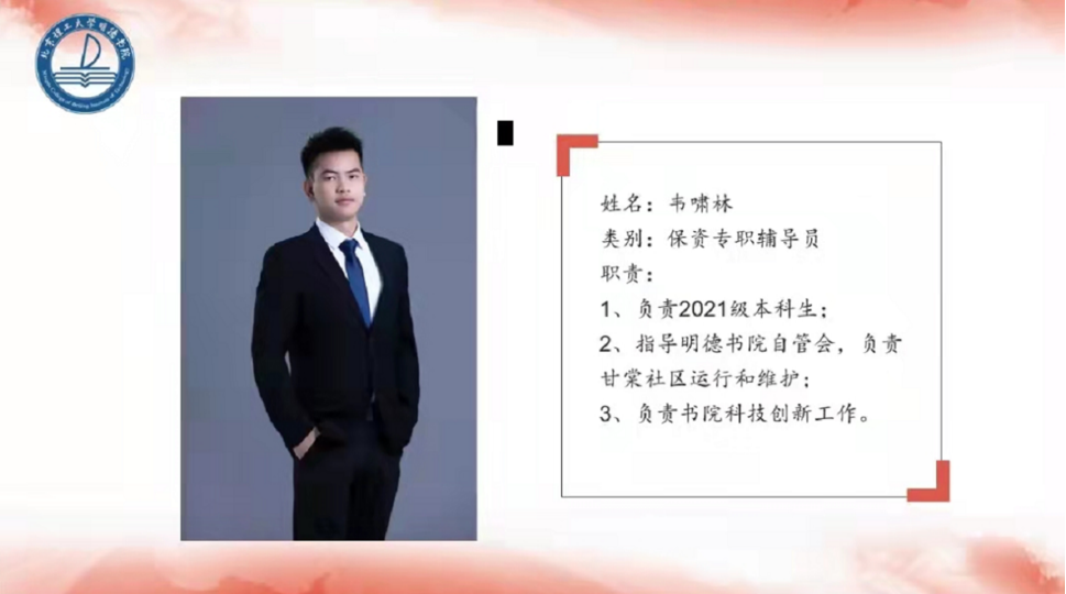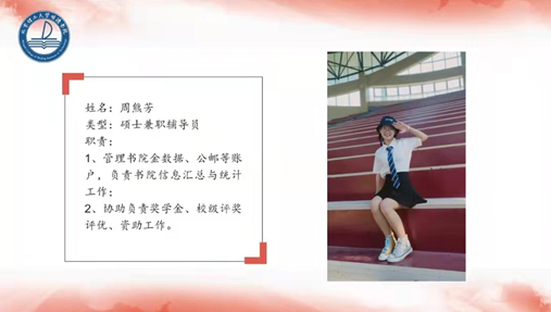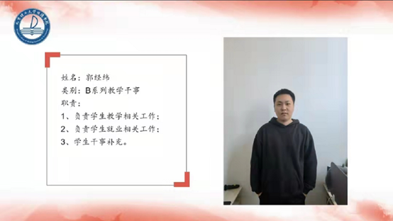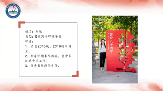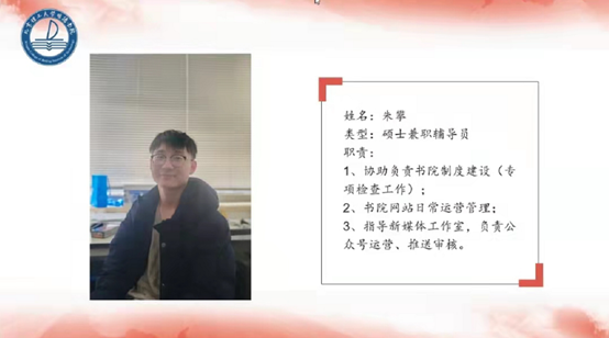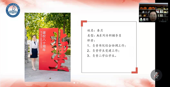 以自身工作经历为根基,从学生思想引领者、学生成才护航者、学生成长贴心人拓三个方面描绘辅导员工作历程;综合室主任秦月以全面聚焦党建发展、夯实网络思政根基、加强学生日常管理三方面统筹书院工作。