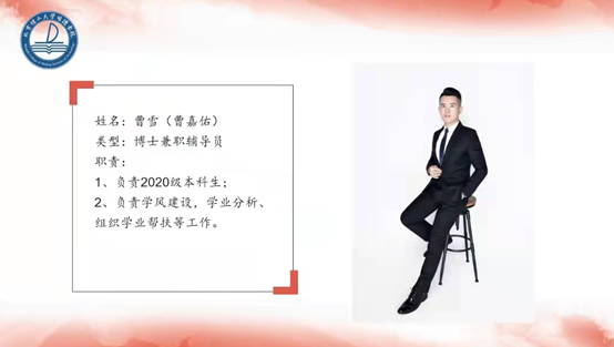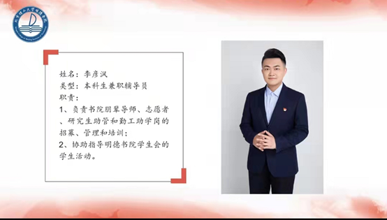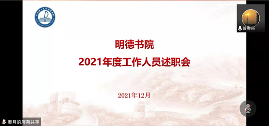 为全面贯彻落实学校育人方针,提升辅导员政治能力和业务水平,充分发挥工作实绩考核的导向,2021年12月7日,明德书院专兼职辅导员述职大会通过线上举行。院长曾粤兴、副院长王一飞、责任教授马秋君、教学副院长郭德忠出席会议。会议由综合办公室主任秦月老师主持。