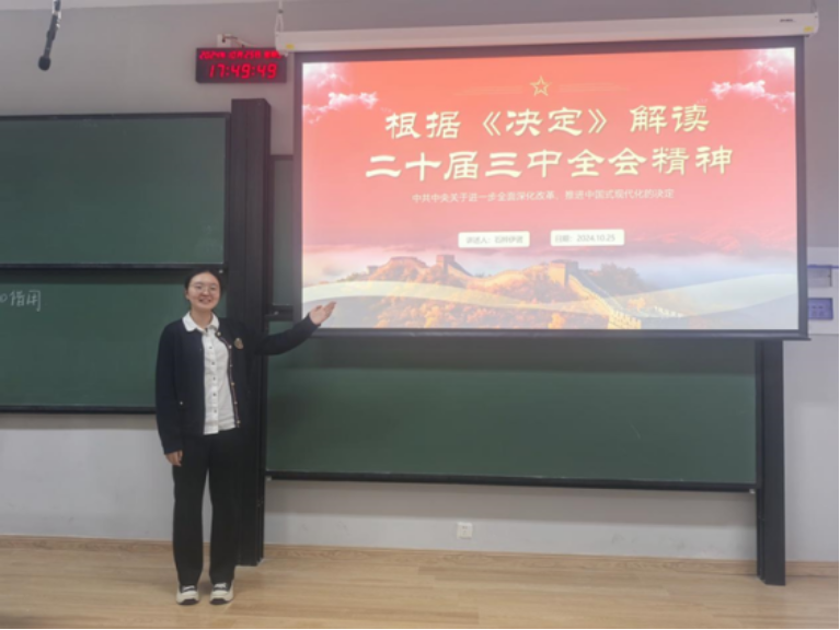 致一团支部举办了名为“学三中全会精神,成德才兼备青年”的主题团日活动。致一团支书王馨仪首先带领班级同学学习了党的二十届三中全会的主要内容和精神,并与同学们分享了现任外交部长王毅的故事。活动过程中同学们畅所欲言,将理论学习与当代大学生的学习生活实际相关联,并立志共同将个人的事业发展融入国家的发展与建设中,让努力和奋斗与时代同频共振,为中国特色社会主义事业的发展添砖加瓦。
