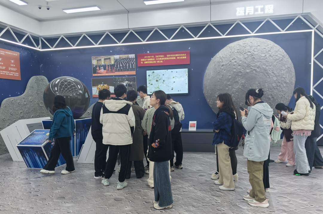 斗士诚坚共抗流,只研朱墨作春山。展馆从近代讲起,一进入展馆,列于墙上的十八般兵器,圆明园的残垣断壁就给同学们带来了不小的震撼。十年携手共艰危,敢有歌吟动地哀。漫漫救国征途上,先辈们上下求索,从近代的筚路蓝缕,艰苦创作,努力保全国家完整,到新中国成立后两弹一星在西北沙丘中爆炸成功,赢得国际地位,再到如今“嫦娥”奔月,“祝融”巡火,科技地位已然居于世界领先。同时,场馆通过模拟探月游戏、裸眼3D看科技成就、实物展品如镇馆之宝“月壤样本”等丰富多彩的展示形式,吸引同学们争相拍照留念。参观学习活动成功在他们心中厚植下红色文脉,做到了实践与育人的深度融合。抚今追昔,灿若星辰,百年风雨过后,春风又绿神州,华夏再沐朝阳。参观完毕后,同学们皆是热血沸,心潮澎湃。