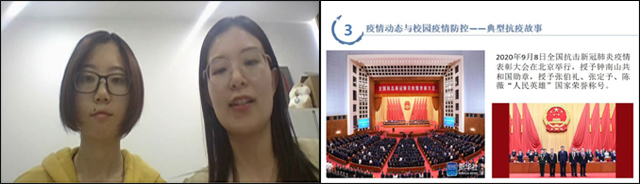 首先,辅导员王海夷总结了学生自新冠肺炎疫情发生以来学习生活情况,肯定了大家的成绩,并对未来表达了期许。辅导员刘敏带领学生为纪念在“九·一八”事变中牺牲的英雄默哀,学习了全国抗击新冠疫情表彰大会上的先进事迹,并再次强调了疫情防控要求,时刻提高警惕不放松。此外,辅导员还解答了学生提出的近期教育教学活动安排等相关问题。