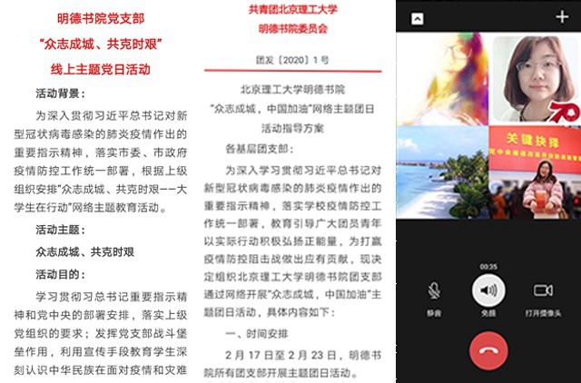 当前新型冠状病毒肺炎疫情的防控工作正处于关键时期,明德书院党支部带领入党积极分子,以“一帮一结对子”、“互助小组”等形式密切联系同学、组织同学、凝聚同学,帮助同学们正常有序地开展居家学习生活。党带领同学们利用“学习强国”平台,开展理论学习活动;鼓励大家运用好在家时间提前学习,为下个学期做准备;组织学习小组,协助、督促同学落实学校利用线上课堂进行远程教学的相关安排,切实做到停课不停学。在党支部的带领下,书院同学相互关心、相互帮助,以积极的态度和良好的身心状态面对疫情与生活,科学安排自己的时间,安心在家配合防疫,为战胜疫情贡献青春力量。
