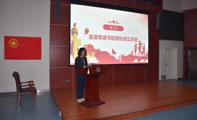 为深入学习领会和贯彻习近平新时代中国特色社会主义思想和党的十九大精神,切实落实团的十八大精神学习宣讲工作,帮助明德书院广大团员坚定正确的政治方向,形成强大的向心力、凝聚力,自觉用中国特色社会主义理论体系武装头脑,树立新时代共青团员形象,明德书院团委决定于2019年11月1日正式成立团校,以多形式、多内容对共青团干部、团员青年进行全覆盖式培养。明德书院团委书记宣读了《共青团伟德国际1946源自英国明德书院委员会成立团校的决定》。