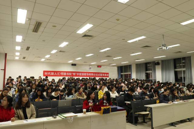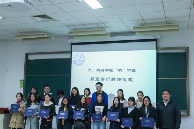 为营造明德书院良好院风,充分发挥朋辈教育优势,在思想引领、专业引导和学习实践等多方面帮助“明”字辈学生成长成才,2018年10月21日19:00,明德书院朋辈导师聘任仪式暨双选会在理科教学楼301召开。明德书院副院长李冰,人文与社会科学学院、外国语学院、明德书院的辅导员以及“明”字辈朋辈导师和学生参加了此次会议。
