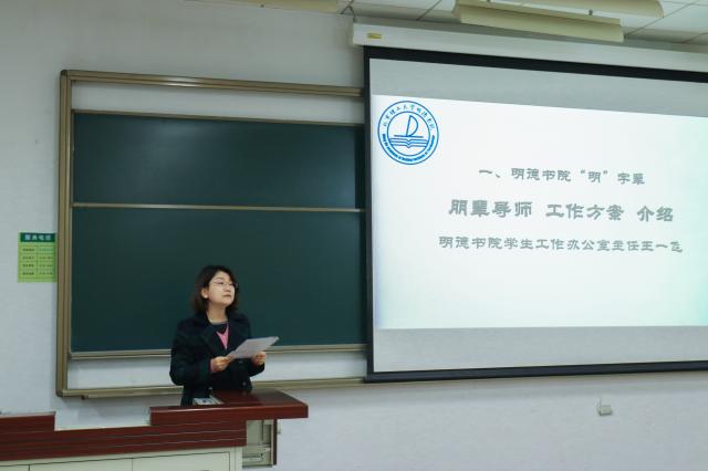 首先,由明德书院教师介绍了 “明”字辈朋辈导师工作方案,涉及朋辈导师组织机构、朋辈导师的组成、工作目标和具体工作安排。她介绍到明德书院“明”字辈朋辈导师根据各自特点和优势被划分为思想引领、专业引导以及学习实践三类,由2018级学生朋辈导师工作领导小组领导,领导小组下设工作办公室组织协调三类导师开展相关工作,并会以学期为单位按照工作方案进行考核,帮助学生树立高远目标和理想信念,引导学生探索高效学习方法,在学习生活中发挥个性特长,促进全面发展。