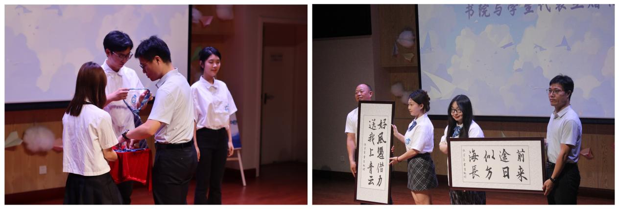 明德书院向2024届毕业生赠送了毕业礼物,通过赠送领带和领结,书院向毕业生传递了步入社会后的责任与担当,鼓励他们在未来道路上以专业形象和态度应对各项挑战。2024届毕业生则以字画回赠书院,对老师们的辛勤付出深情致谢,传达对书院和母校的浓厚情意。