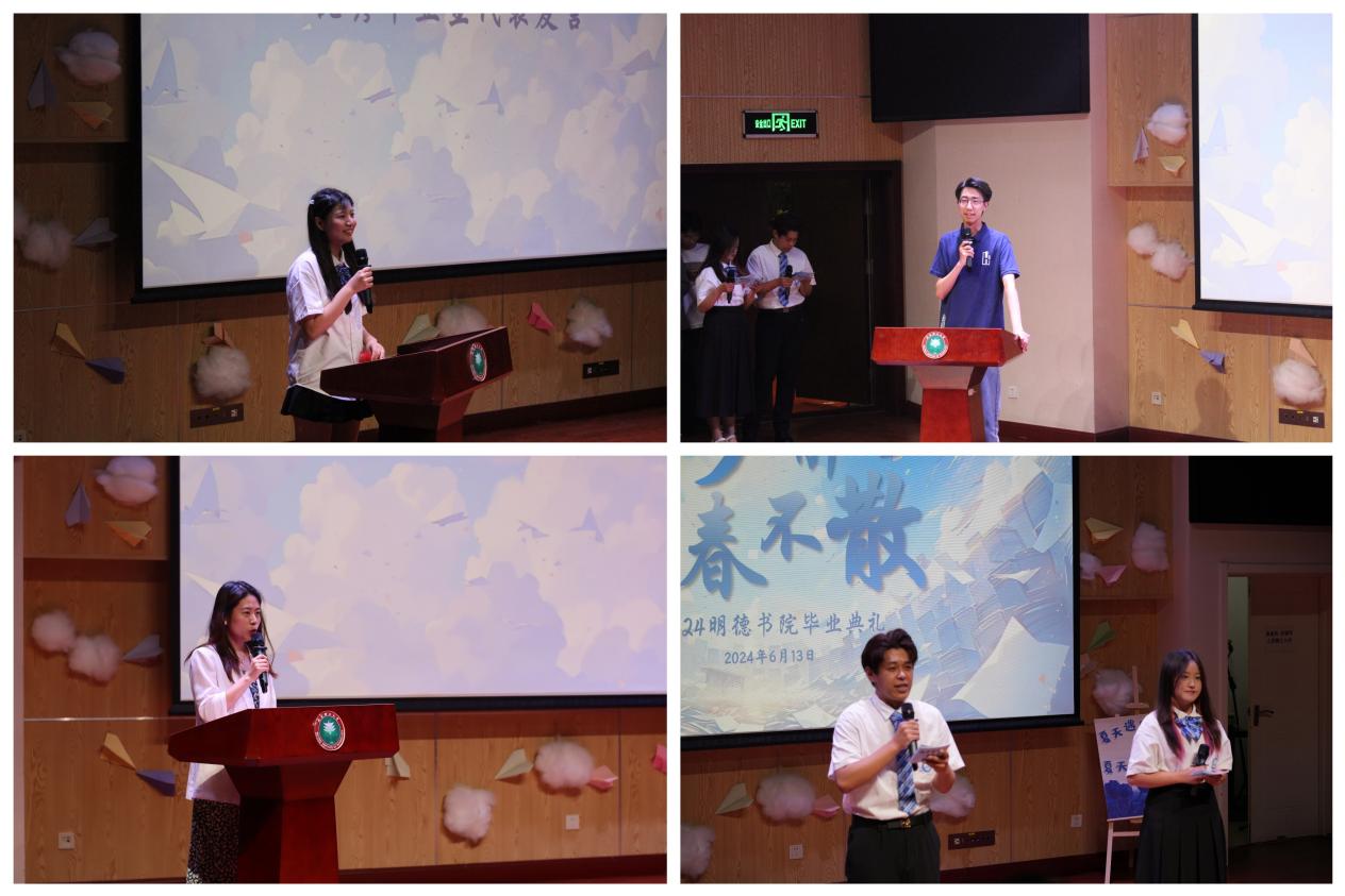 表彰过后,2020级法学专业学生张承云作为优秀毕业生代表,分享了她的成长历程与毕业感悟。2019级优秀校友白龙霄的宝贵经验和独到见解为即将步入社会的毕业生们点亮了前行的灯塔。张怡老师作为学育导师代表,结合学校育人理念以及明德书生们所学专业的特点向毕业生们表达了诚挚的祝福和期望。