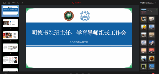 为贯彻落实2020年学校工作会议精神,强化疫情防控期间学生教育引导和学风建设,6月3日上午,明德书院召开线上班主任、学育导师组长工作会。明德书院副副院长,2018级班主任、2019级学育导师组长以及辅导员参加了会议。会议由王海夷主持。