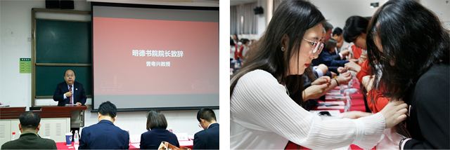 2020年是不平凡的一年,受新冠肺炎的影响,新生的报到时间比往年晚了一个多月。为了重拾砥砺学习奋斗的精神,进一步提升新生的归属感,同时庆祝这迟到的相聚,在报到当天下午4时,明德书院隆重召开了“2020级本科新生开学典礼暨新生见面会”。明德书院、人文与社会科学学院、法学院和外国语学院全体院领导、2020级学育导师、辅导员以及全体新生参加了大会。明德书院院长曾粤兴致欢迎辞,外国语学院高波代表“三全育人”导师、明德2006班高冰洁代表新生进行了发言,与会领导和老师为新生代表佩戴了书院院徽。开学典礼的召开,成为了书院2020级学生迈入大学学习生活的重要标志。