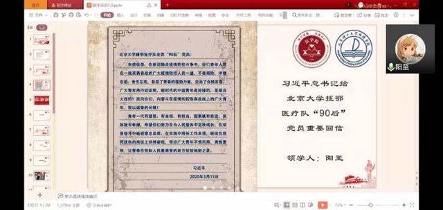 为深入学习贯彻习近平总书记给北京大学援鄂医疗队“90后”党员重要回信精神,积极响应“担复兴大任,做时代新人”主题教育活动的号召,2020年4月10日下午,明德书院2018级明宸团支部和法学院研究生第一党支部、2019级学硕团支部的同学们共同开展了“共学回信精神,同担复兴大任”联学共建活动。明德书院、法学院专职团干部参加了此次活动。活动分为学习理论知识、讲述抗疫故事、讨论学习方法和展示抗疫作品四个部分。同学们从单个支部走出去,结识新朋友,互相学习交流,收获颇丰。
