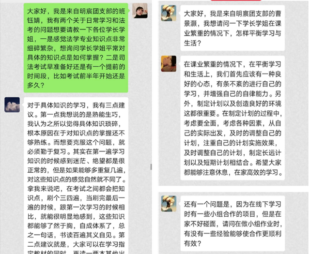 “长时间在家中线上学习学习效率很低,想问问学长学姐们怎样在家中长期保持高效学习呢?”明德书院明宸团支书赵语迟就最近居家学习遇到的问题向学长学姐们提出问题。