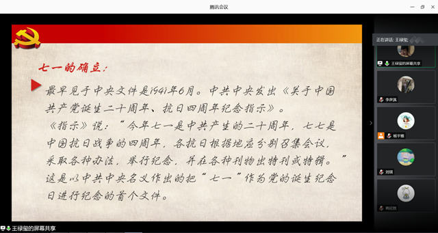 学习党的历史,学习理论,提高自身理论素养,是我们党员为党献礼的最好方式之一。杨宇雅、王禄玺、刘琪三位同志从“七一”党的生日出发,讲解建党日定在“七月一日”的由来,并回顾党99年来的光荣历程。“‘七一’这个光辉的节日深深地铭刻在全党和全国各族人民的心中。它成为人们每年进行纪念的一个重要节日,也成为中国节日文化的一部分。”