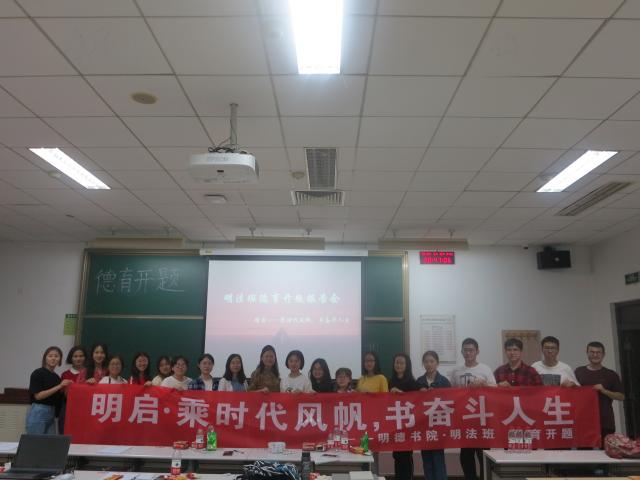 为树立远大理想、明确成长方向、找准成长路径,2019年5月10日18:30,明法班召开以“乘时代风帆,书奋斗人生”为主题的德育开题。在场的嘉宾有班主任彭海青和辅导员王海夷。明法班全体同学参与其中。