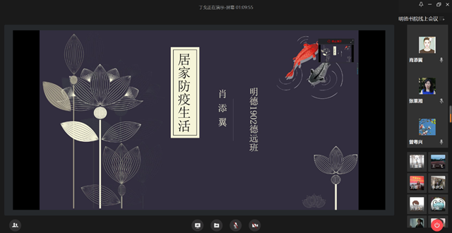 同学们依次分享在疫情期间居家生活、学习情况和成长收获,并对网络教学环节、学生活动等方面提出意见和建议。同学们在以高度的学习热情投入到线上学习的同时,也养成了良好习惯,如日常锻炼、培养良好生活技能等。黄思旅表示,当学习热情有所下降,她选择和同学一起结伴学习、互相督促的方式,取得了良好的效果。朱宇玮表示,面对疫情,学习生活之余,他响应号召,积极从事志愿服务工作。