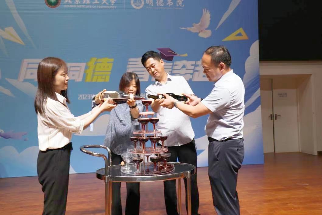 最后,领导嘉宾与毕业生们举杯同庆,合影留念。现场礼花绚烂多彩,气氛热烈,领导嘉宾共同举杯,将香槟酒倒入香槟塔中,毕业生们开启明德毕业季专属汽水共同分享毕业的喜悦。至此室内环节落下帷幕,毕业典礼转入室外环节。