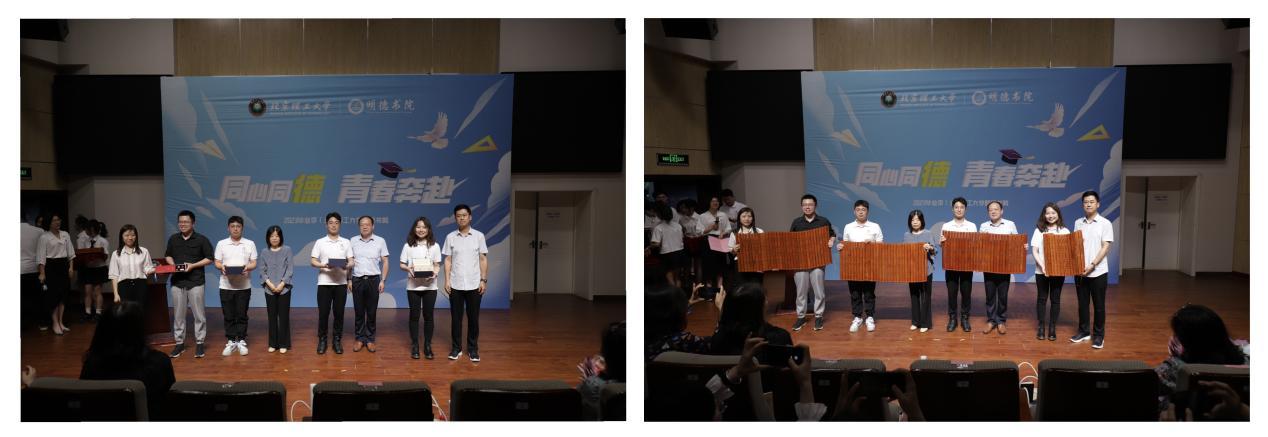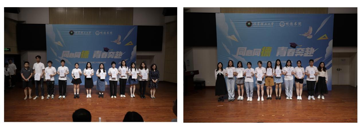 明德书院德昭班学育导师组长郑佳然、德正班学育导师组长薛少华、人文与社会科学学院学生工作办公室主任、团委书记颜笑、外国语学院学生办公室主任、团委书记马链、明德书院原朋辈导师、2018级学生代表李彦沨、冯靖涵等为明德书院优秀毕业书生颁发荣誉证书并合影留念。