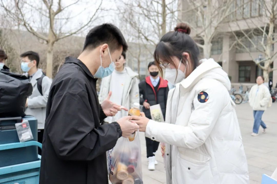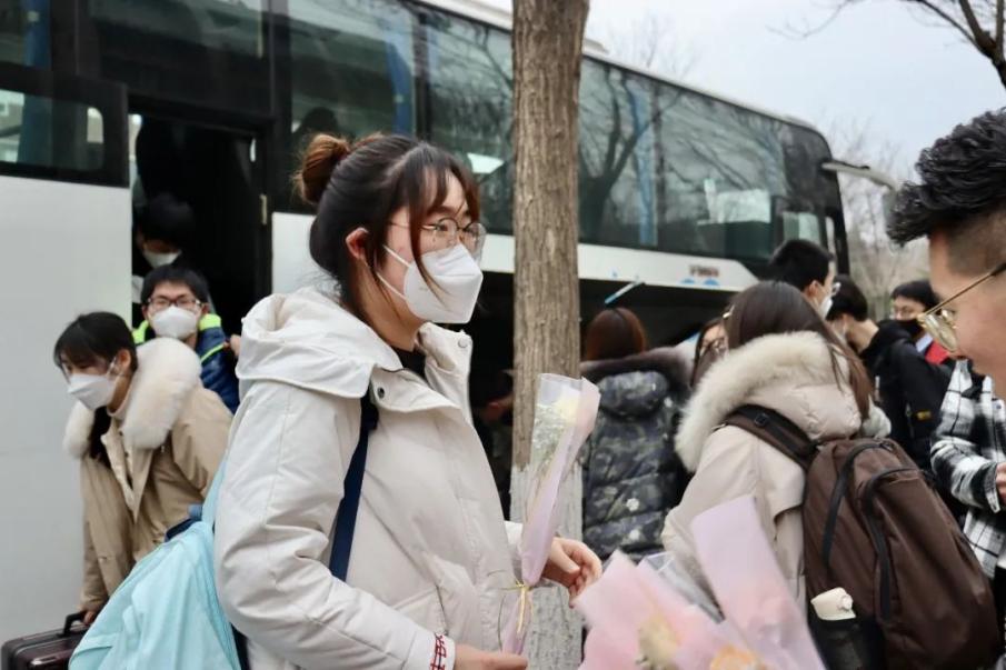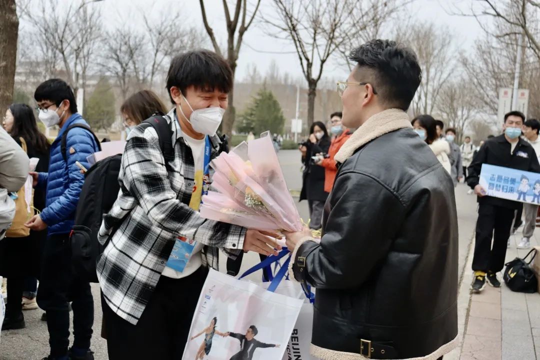 在图书馆门口,专兼职辅导员张俊杰、曹嘉佑、李彦沨为志愿者送上鲜花表示对志愿者的欢迎与慰问,祝贺志愿者们光荣完成使命。